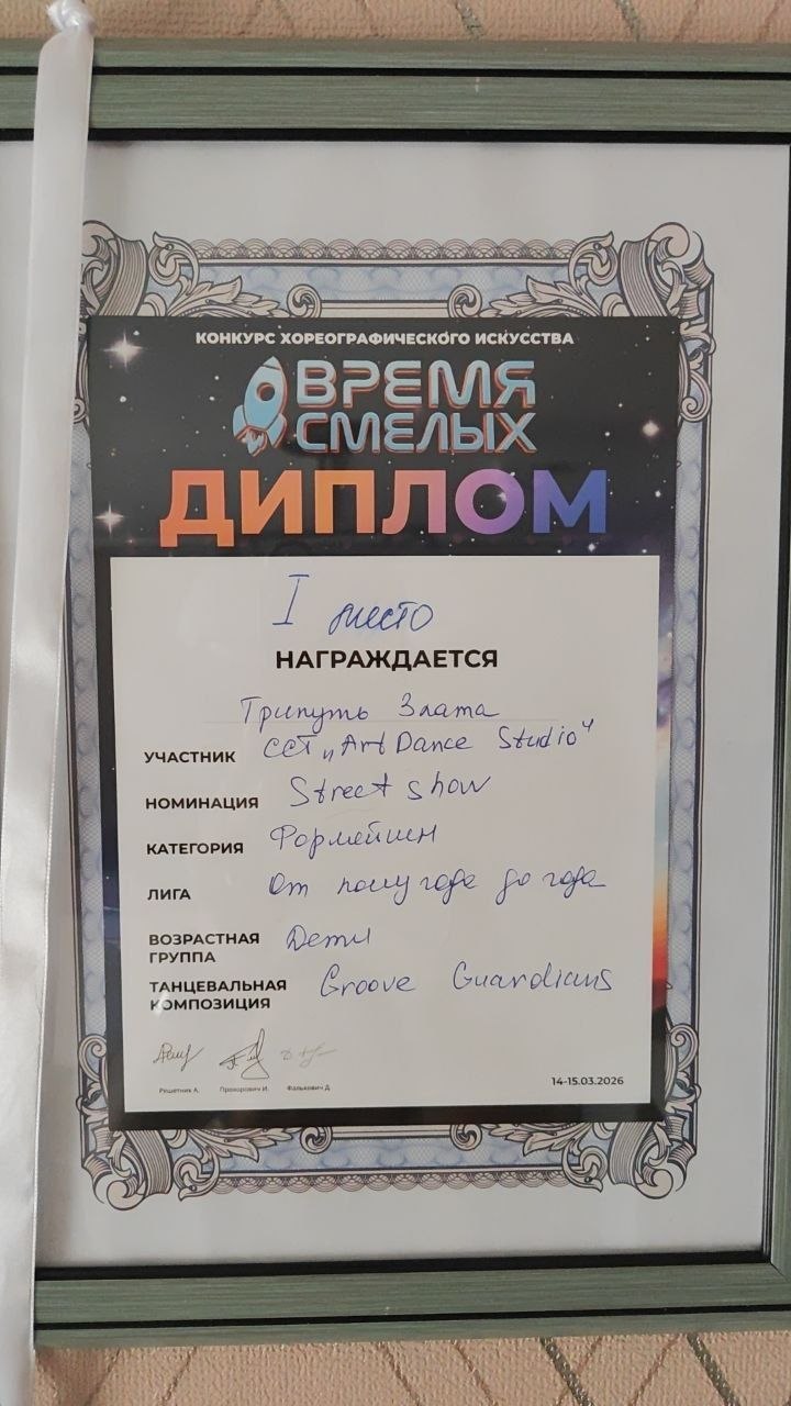 Настя с большим удовольствием посещает студию современного танца Art DANCE STUDIO (руководитель Бурнос-Таврук Виктория Викторовна). Современные танцы девочке очень нравятся, она любит выступать и получать награды. В арсенале Полуян Насти медаль и грамота (3 место) в Чемпионате по современным танцам и фестивале сценического искусства «Зимний Фристайл» (2025). Заслуженное третье место команда получила в номинации Стрит шоу Формейшн в возрастной категории Дети 1. Поздравляем Настю с ПОБЕДОЙ, ГОРДИМСЯ и желаем новых творческих успехов!